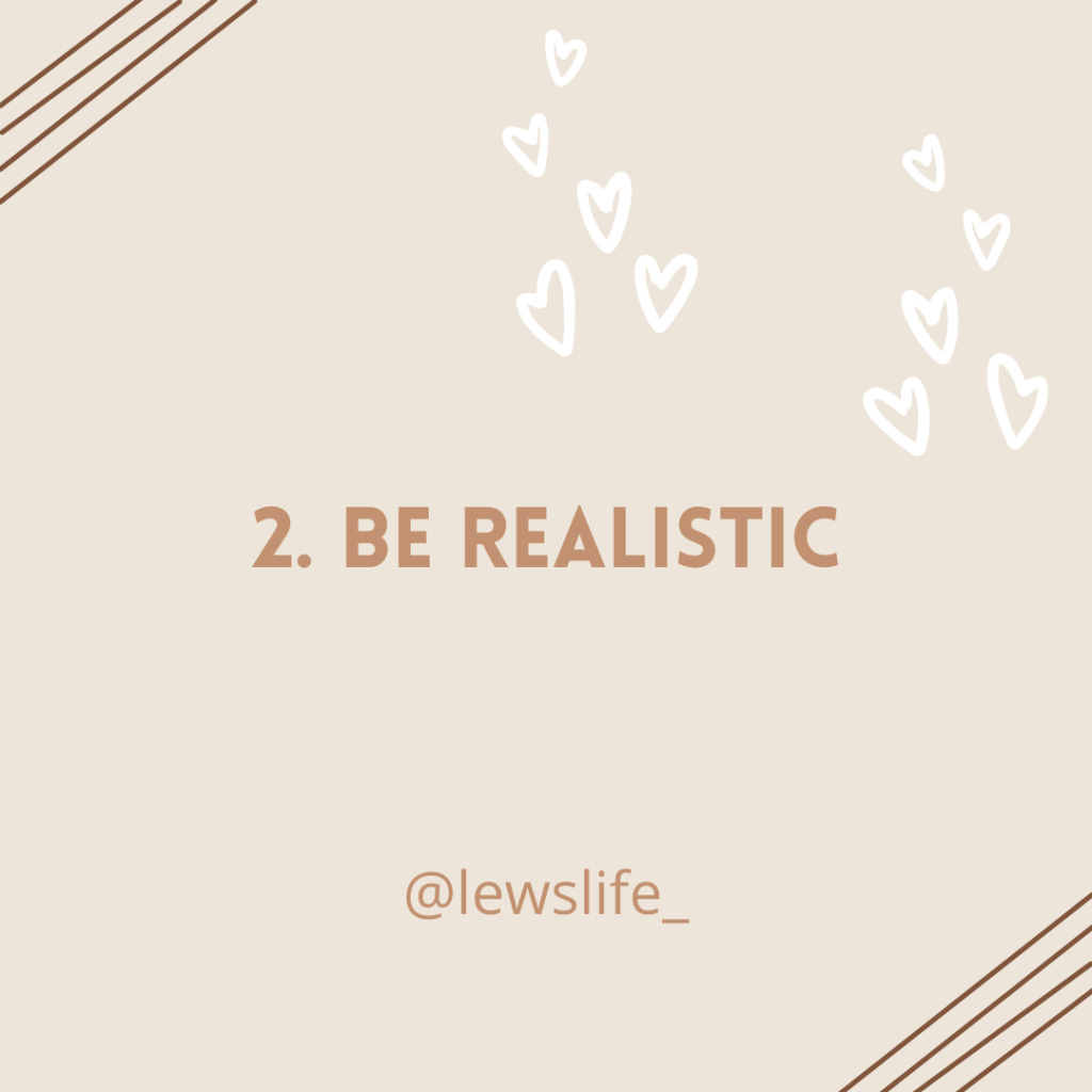 Be Realistic – it is all too common that we will make big goals and not be able to keep up to them because they were too big of a step. Start small and make attainable goals, this includes not being so hard on yourself! If something in your life calls for 15 min of your time but you have 5 min, then do it for 5 min. Keep it simple, because doing it for the time you have is better than not doing it at all.