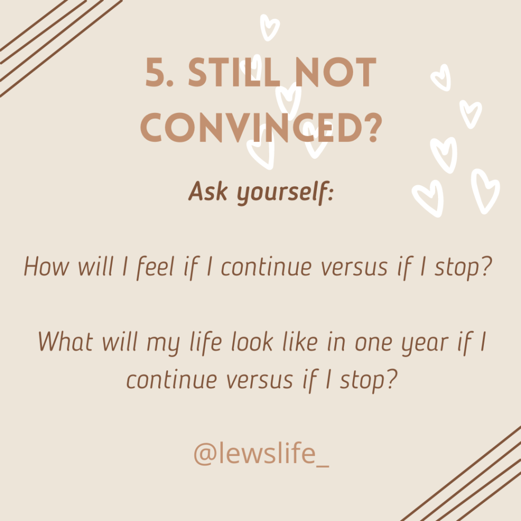 Still Not Convinced? Ask yourself these two questions: How will I feel if I continue versus if I stop? What will my life look like in one year if I continue versus if I stop?