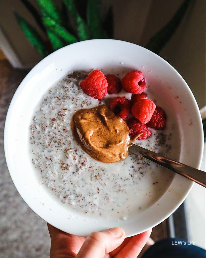 Ingredients: 2 TBS Shredded Coconut 2 TBS Ground Flaxseeds 2 TBS Chia Seeds 1-2 TBS Maple Syrup 1/2 Cup Boiling Hot Water 1/2 Cup Plant Based Milk or Regular Milk Additives: You could also add hemp seeds, or nuts and seeds to bulk it up even more!